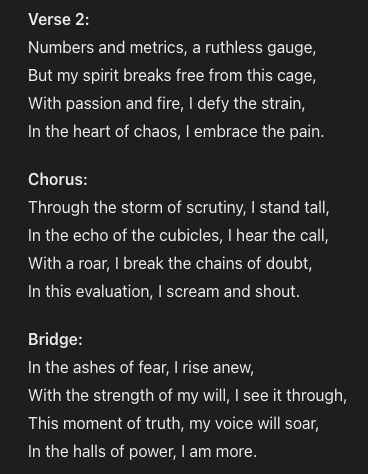 “But my spirit breaks free from this cage / With passion and fire, I defy the strain” Wow. Yeah, Bob in HR is definitely going to hear about this meeting.