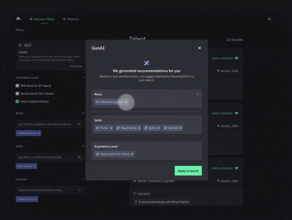 GunAI does more than just search; it understands. When you upload a job description, GunAI meticulously parses the text to extract essential details like roles, specific skills, frameworks, geographic preferences, industry experience, and more. But it doesn’t stop there. GunAI also recommends the precise search filters to apply in Discover Talent Search to instantly produce the best talent matches.